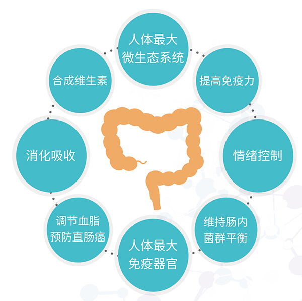 腸道和其內部菌群所構成的“腸道微生態系統”是人體最大的“免疫器官”,人體70%的免疫力來自于腸道。腸道同時還可以通過“肺腸軸”、“腦腸軸”、“肝腸對話”等機制對
